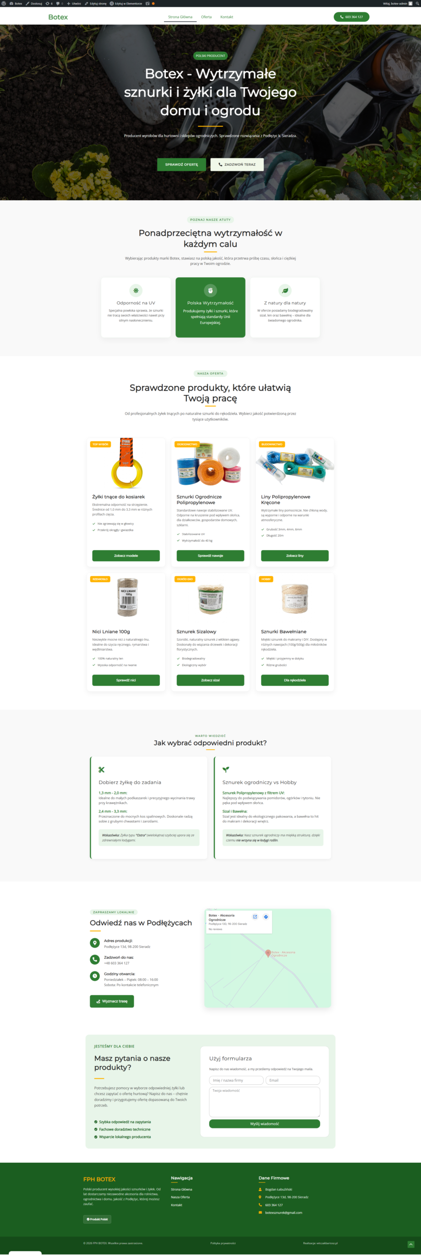 Sklepbotex.pl to nowoczesna witryna wizerunkowo-produktowa polskiego producenta sznurków i żyłek z Podłężyc k. Sieradza. Projekt został zaprojektowany z myślą o przejrzystej prezentacji bogatego asortymentu dla domu, ogrodu i rolnictwa. Strona kładzie duży nacisk na doradztwo techniczne oraz budowanie profesjonalnego wizerunku marki, zapewniając łatwy dostęp do oferty hurtowej i danych kontaktowych producenta.
