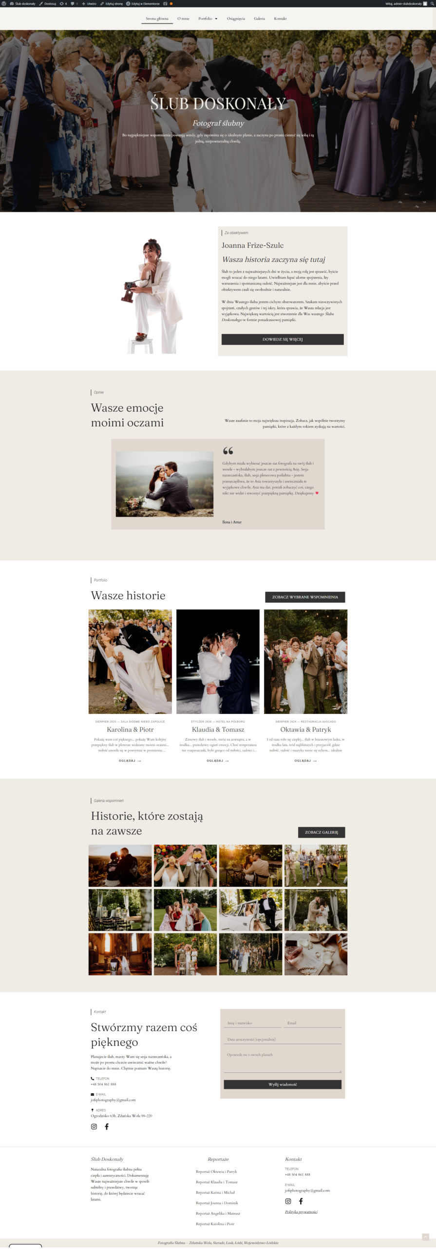 Slubdoskonaly.com to elegancka witryna stworzona dla fotografki ślubnej, działającej głównie na terenie województwa łódzkiego. Projekt skupia się na emocjonalnej prezentacji reportaży ślubnych oraz sesji plenerowych. Strona łączy w sobie minimalistyczny design z wysoką estetyką galerii, ułatwiając potencjalnym parom młodym zapoznanie się z portfolio, opiniami klientów oraz szybkie nawiązanie kontaktu.